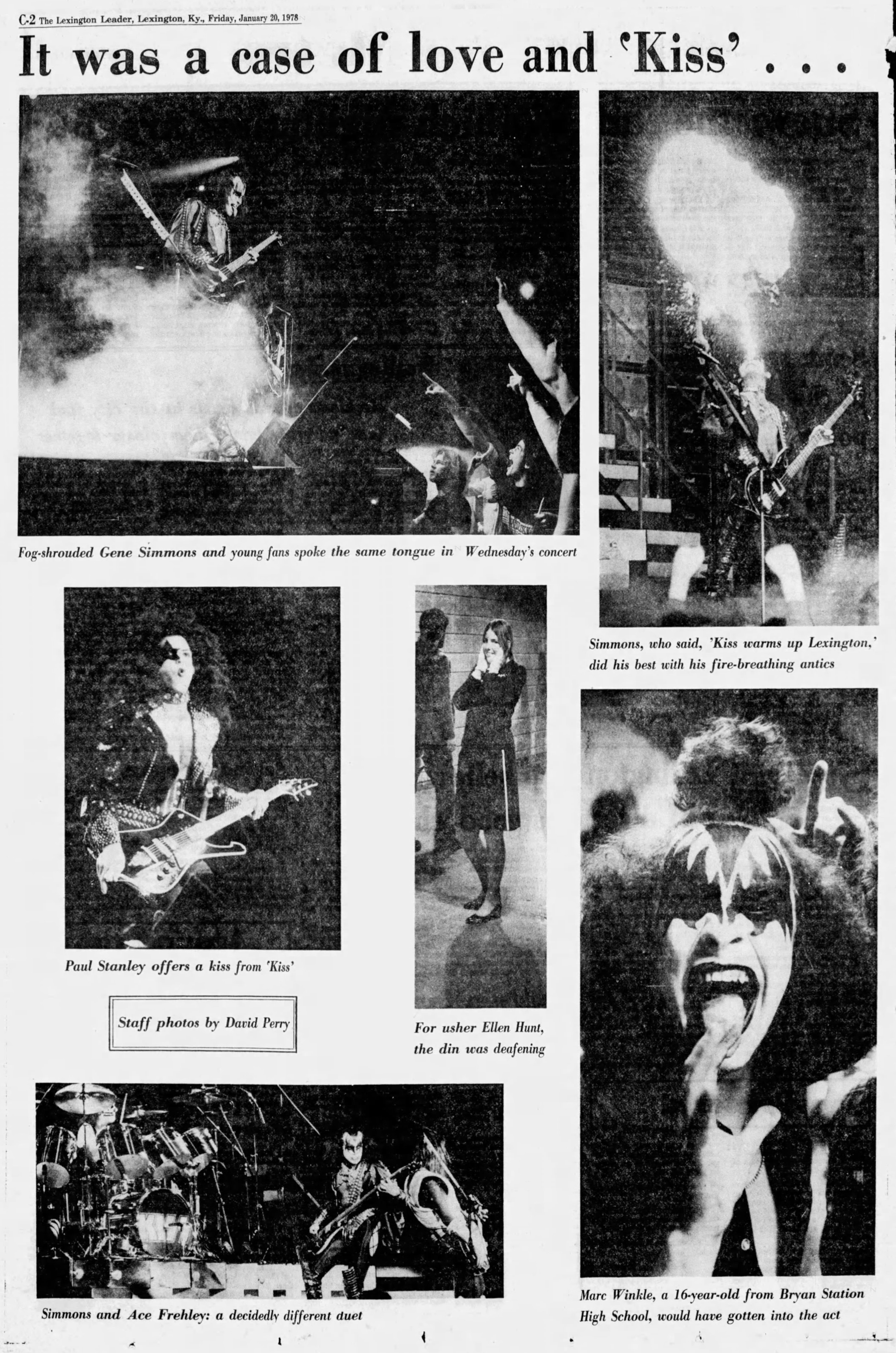 I wasn't able to attend the January 18, 1978, KISS concert in Lexington, KY—and it's just as well, as there was a massive snowstorm that night, which would have prevented my going, even if we'd been able to get tickets. In early 2006, Miles Reucroft sent me these clippings from the Lexington newspapers regarding the January 18, 1978, Lexington show. Thanks, Miles! |